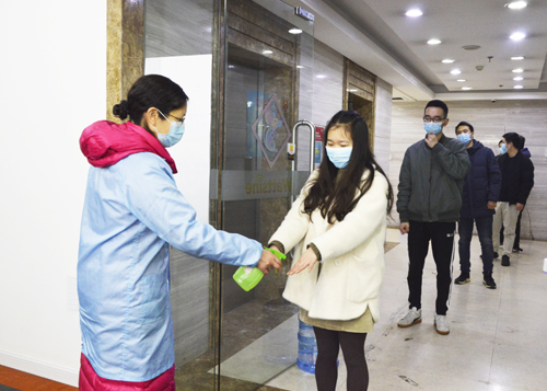 复工日,员工们戴着口罩,经过有序排队消毒测量体温后方可入司复工。